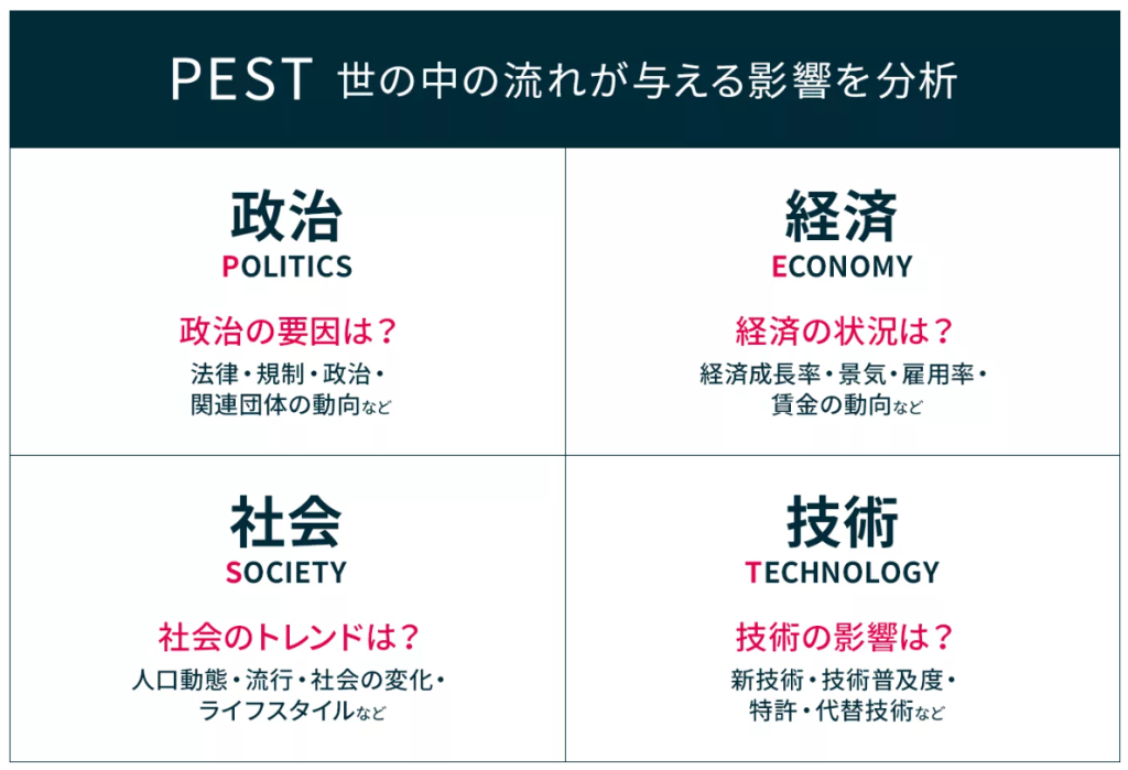 オススメなのは「PEST分析」です。
